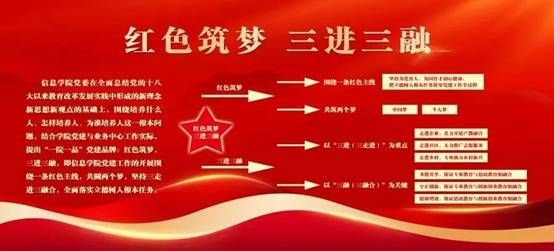 创建“红色筑梦,三进三融”党建品牌。品牌紧紧围绕立德树人一条红色主线,共筑两个梦,开展走进企业,走进社区,走进乡村的实践活动,推进有机融合专业育人、思政育人与创新创业育人的新模式,更好落实立德树人根本任务,坚守为党育人为国育才使命。推动党建与业务工作的深度融合,用新思政观构建高校育人生态圈。