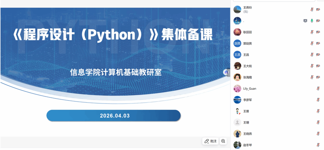 计算机基础教研室组织全体任课教师通过线上会议平台,开展了《程序设计(Python)》课程的线上集体备课活动。全体任课教师齐聚云端,围绕课程设计、教学方法和学生能力培养等议题进行了深入研讨。