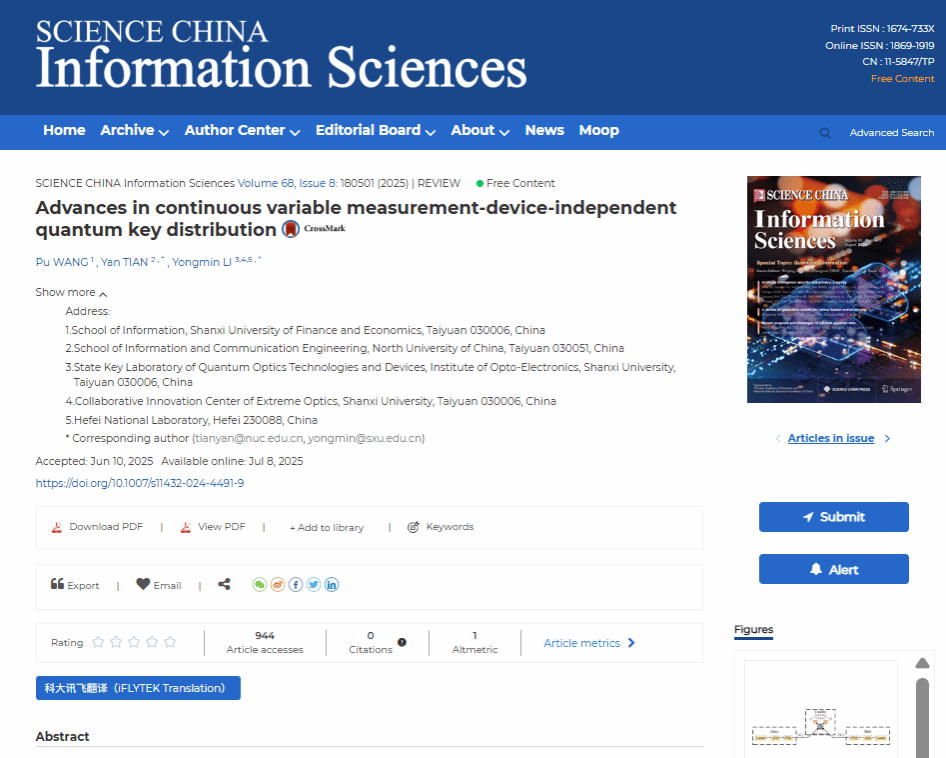 青年教师王普博士的研究成果“Advances in continuous variable measurement-device-independent quantum key distribution”在《中国科学:信息科学》2025年第8期(Science China Information Sciences, 2025, 68(8), 180501)上发表,该期刊系世界杯冠军预测